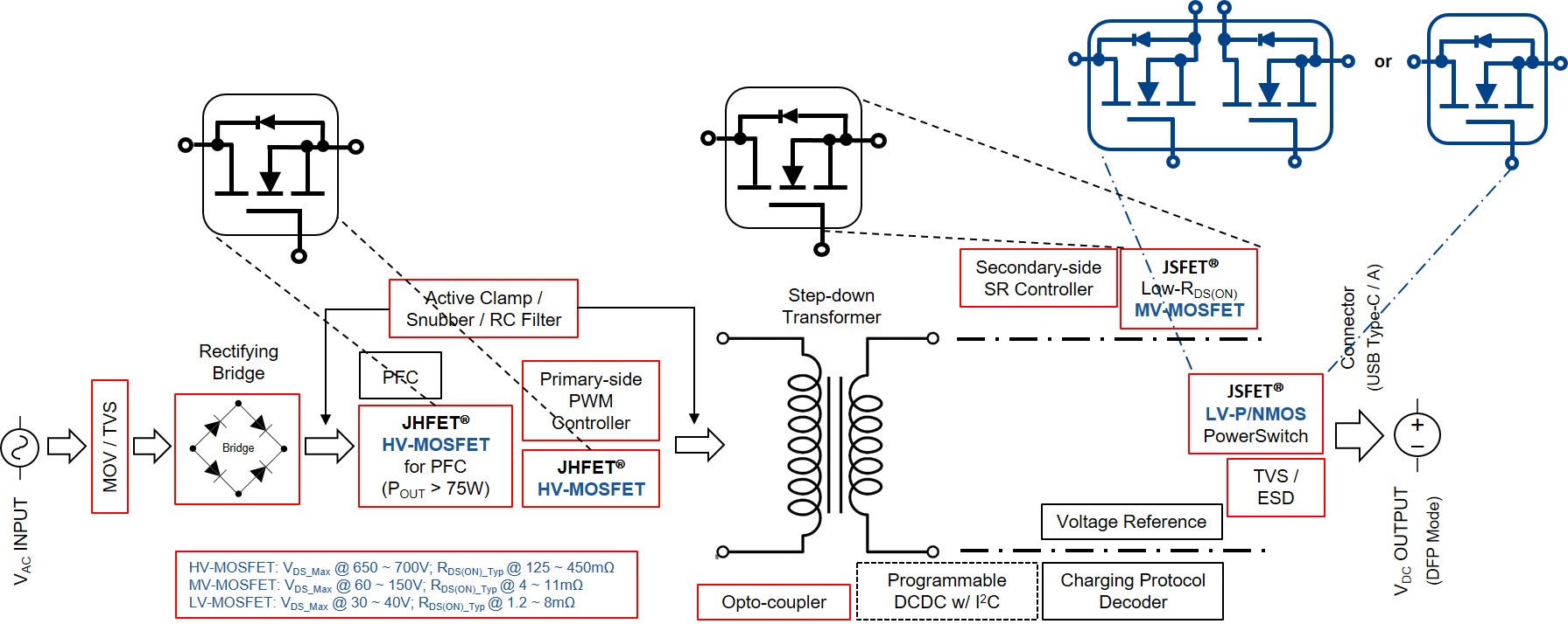 岂论在原边使用的是古板的超结高压 MOSFET、或是日益受电路设计工程师及消耗者追捧的氮化镓 D/E-mode HEMT,,, ,, ,,,在拓扑的副边,,, ,, ,,,优德88最新官网先进 JHFET? 手艺平台超结 (super-junction) 的高压 MOSFETs 在原边开关、先进 JSFET? 手艺平台的中/低压 MOSFETs 在同步整流和在 USB-C? 端口电流输出开关等位置,,, ,, ,,,都能提供稳固可靠而高功效的运作。 。。。。。。